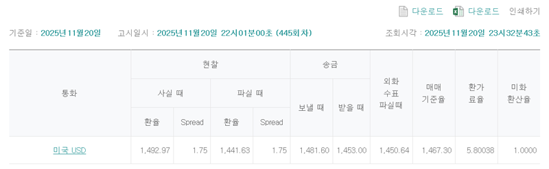 5. 모든 설정을 마친 후 조회하면 해당 날짜와 회차의 기준 환율 정보가 나타납니다. 현찰을 사거나 팔 때, 송금을 보내거나 받을 때의 환율 등 세부적인 내용이 표 형태로 정리되어 있어 한눈에 파악하기 용이합니다.