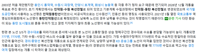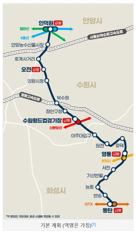 6. 이 사업은 2003년 처음 제안된 이후 여러 번의 계획 변경을 거쳐 지금의 모습으로 확정되었습니다. 초기에는 인덕원-수원선으로 불렸으나 종점이 동탄으로 변경되면서 명칭도 바뀌었습니다. 노선 대부분이 상습 정체 구간인 경수대로를 따라가기 때문에 개통되면 도로 교통량을 분산시키는 효과가 클 것이며 기존의 광역버스 수요도 일부 흡수할 것으로 예상됩니다.