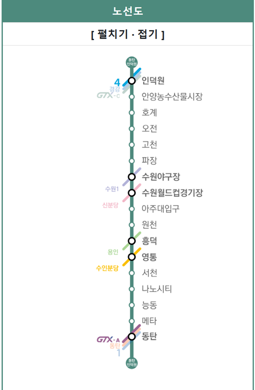 4. 지도상의 경로를 확인해보면 안양, 의왕, 수원, 용인, 화성 등 경기 남부의 5개 주요 도시를 남북으로 관통하는 형태입니다. 특히 주목할 점은 급행열차 정차역인데 인덕원, 오전, 수원월드컵경기장, 영통, 동탄역 이렇게 5곳에 섭니다. 이 급행 역들을 이용하면 먼 거리도 빠르게 이동할 수 있어 장거리 통근자들에게 큰 도움이 될 것입니다.