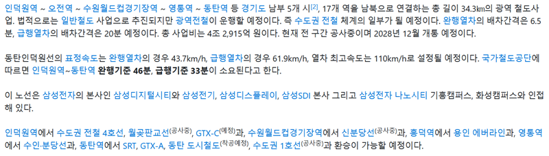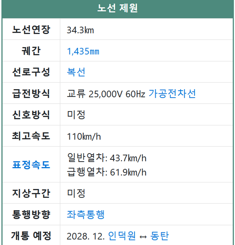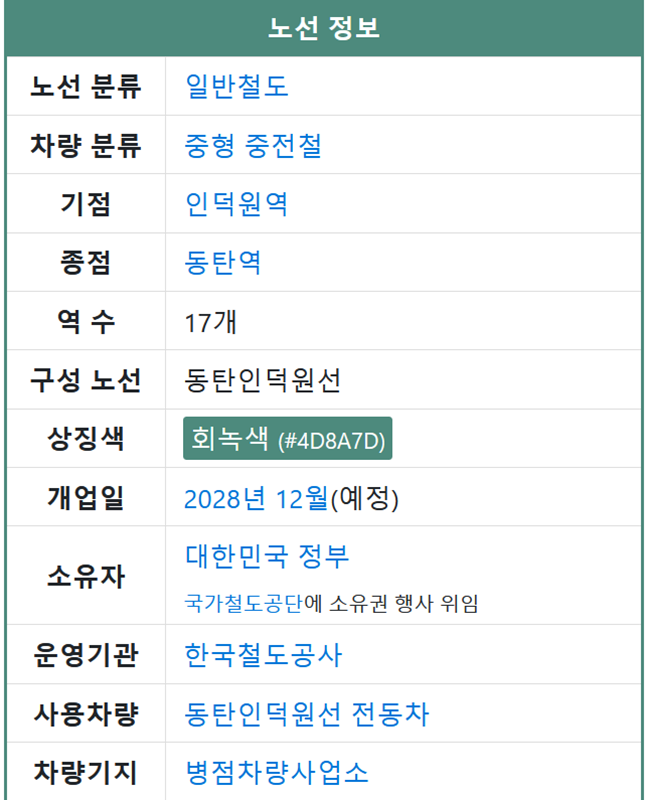 1. 이 노선의 기본 정보를 살펴보면 일반철도로 분류되지만 실제로는 수도권 전철의 기능을 수행합니다. 안양시 인덕원역을 기점으로 화성시 동탄역까지 총 17개의 정거장이 들어서게 됩니다. 노선을 상징하는 색은 회녹색으로 정해졌으며 2028년 12월 개통을 목표로 공사가 진행 중입니다. 시설은 대한민국 정부가 소유하고 운영은 한국철도공사가 맡게 됩니다.