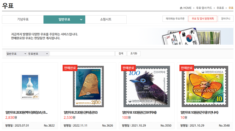4. '일반우표' 메뉴에서는 편지나 소포에 붙이는 데 사용되는 보통우표들을 모아볼 수 있습니다. 다양한 액면가와 디자인의 우표들이 준비되어 있습니다.