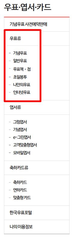 2. '우표·엽서·카드' 메뉴 아래로 나타나는 '우표류'에서 원하는 종류를 고를 수 있습니다. 기념우표, 일반우표, 우표책 등 세분화된 목록이 나타납니다.