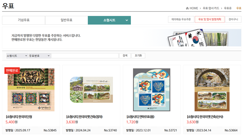 5. '소형시트'는 여러 장의 우표가 하나의 종이에 인쇄된 형태입니다. 특별한 주제나 디자인을 담고 있어 수집용으로 인기가 많으며, 종류별로 모아볼 수 있습니다.