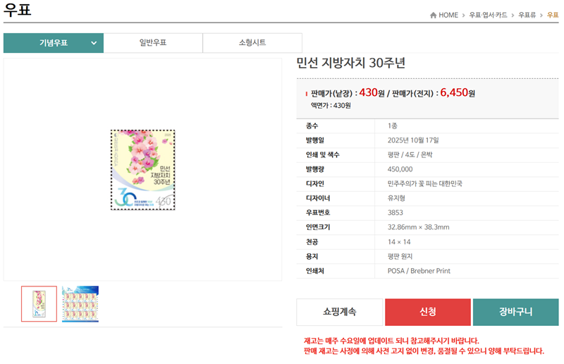 6. 마음에 드는 우표를 발견했다면, 해당 우표를 눌러 상세 정보를 확인합니다. 가격과 발행일, 디자인, 인쇄 방식 등 구체적인 내용을 살펴볼 수 있습니다.
