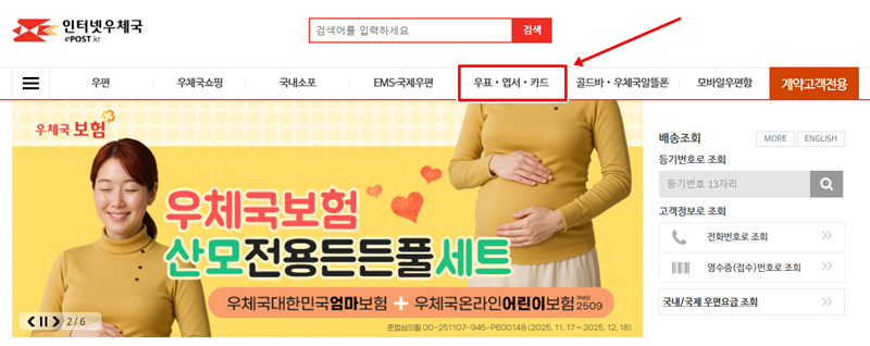 1. 홈페이지 상단 메뉴에서 '우표·엽서·카드' 항목을 선택하여 우표 관련 서비스로 이동합니다. 이곳에서 다양한 우표와 엽서, 카드 정보를 확인할 수 있습니다.