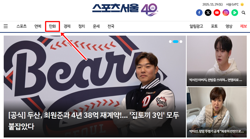 6. 스포츠서울 홈페이지로 이동하면 상단 메뉴 중 '만화' 항목을 통해 만화 전용 공간으로 들어갈 수 있습니다.