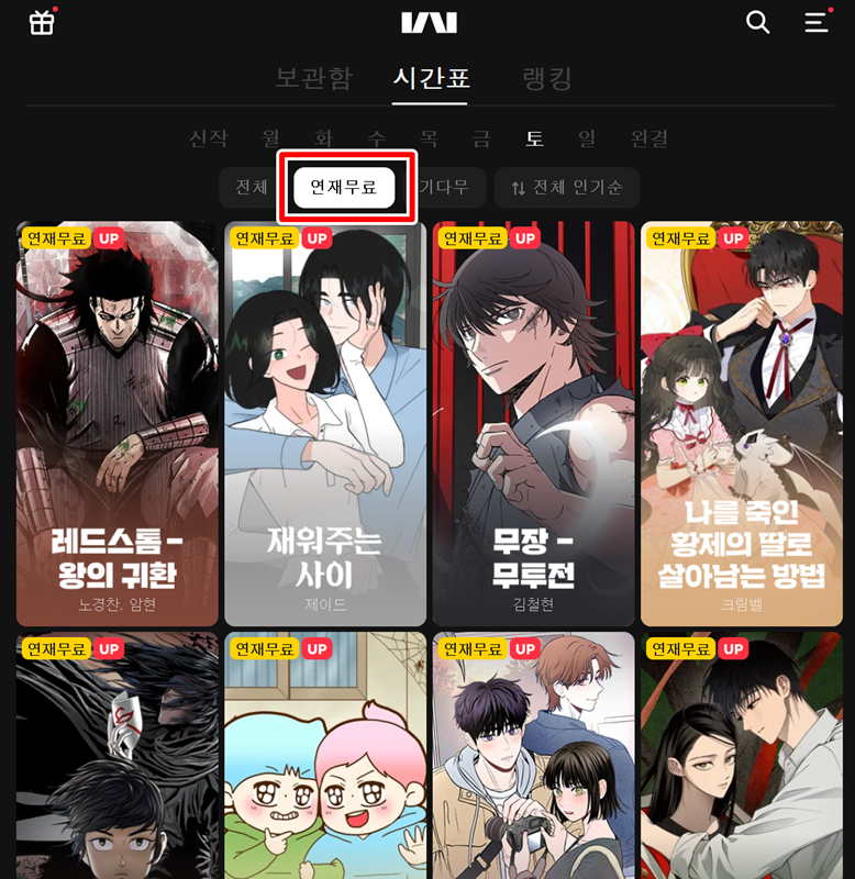 1. 카카오웹툰 홈페이지에서는 '시간표' 메뉴에서 '연재 무료' 항목을 선택하여 지금 바로 볼 수 있는 무료 연재 만화들을 확인하실 수 있습니다.