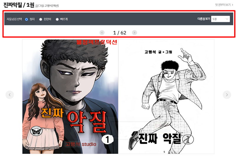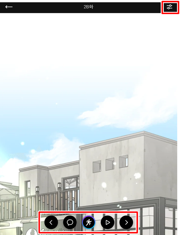 9. 만화를 읽을 때는 화면 상단에 위치한 재생 장치 조작 단추를 활용하여 페이지 넘김 방식을 조절하거나, 다른 권으로 이동하는 등 편리하게 감상할 수 있습니다.