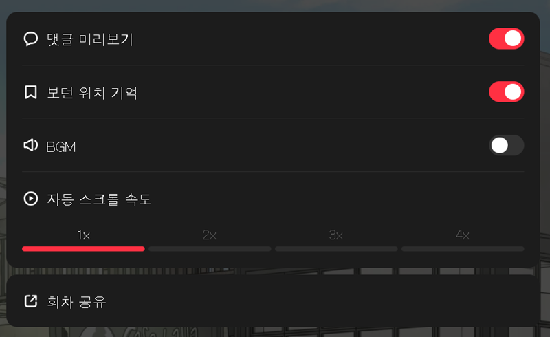 5. 만화 읽기 화면 오른쪽 상단의 톱니바퀴 모양을 누르면 댓글 미리보기, 보던 위치 기억, 배경 음악 재생, 자동 스크롤 속도 조절 등의 읽기 환경을 설정할 수 있습니다.