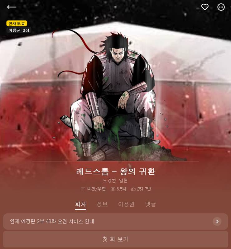 2. 선택한 만화의 상세 페이지에서는 작품 소개와 함께 '회차' 메뉴를 통해 전체 에피소드를 살펴볼 수 있으며, '첫 화 보기'를 눌러 이야기를 시작할 수 있습니다.