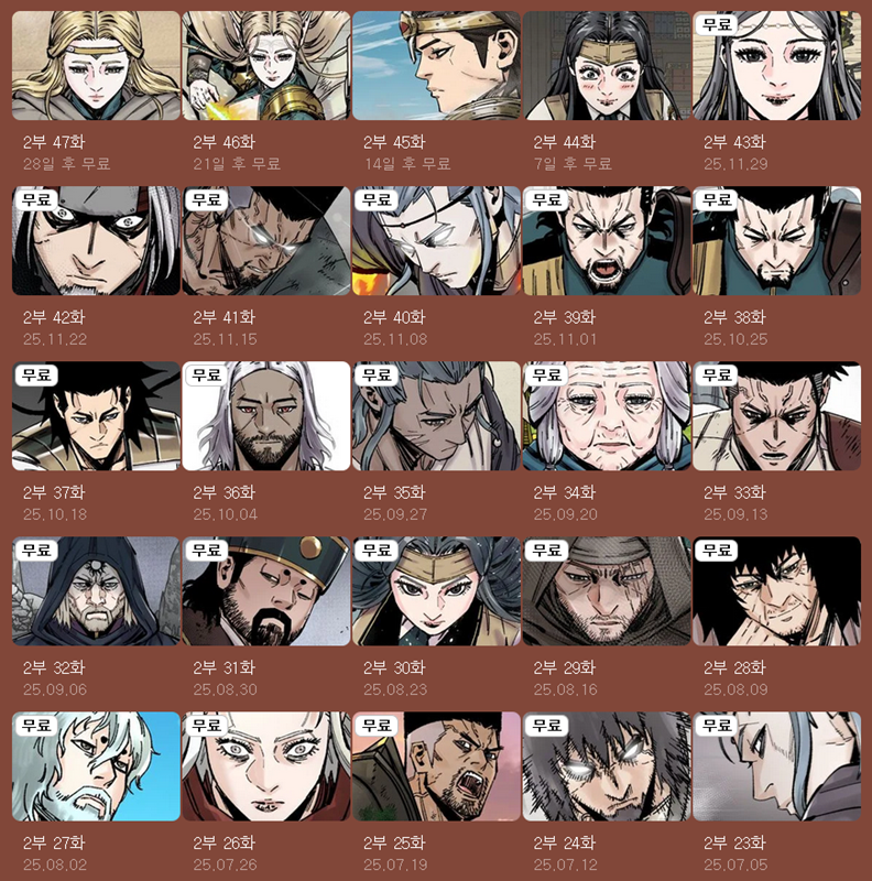 3. 만화의 각 에피소드는 무료 또는 유료로 구분되어 있으며, 일부 에피소드는 '무료' 표시와 함께 날짜가 적혀 있어 언제 무료로 풀리는지 알 수 있습니다.
