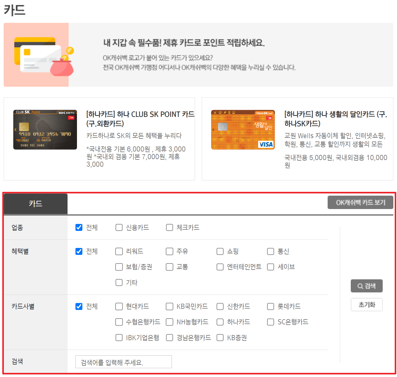 2. ok캐쉬백카드는 로고가 붙어있으면 전국 가맹점 어디서나 이용이 가능합니다. 카드를 신청하기 위해서 원하는 업종, 혜택별, 카드사별을 선택하고 검색을 눌러주세요.