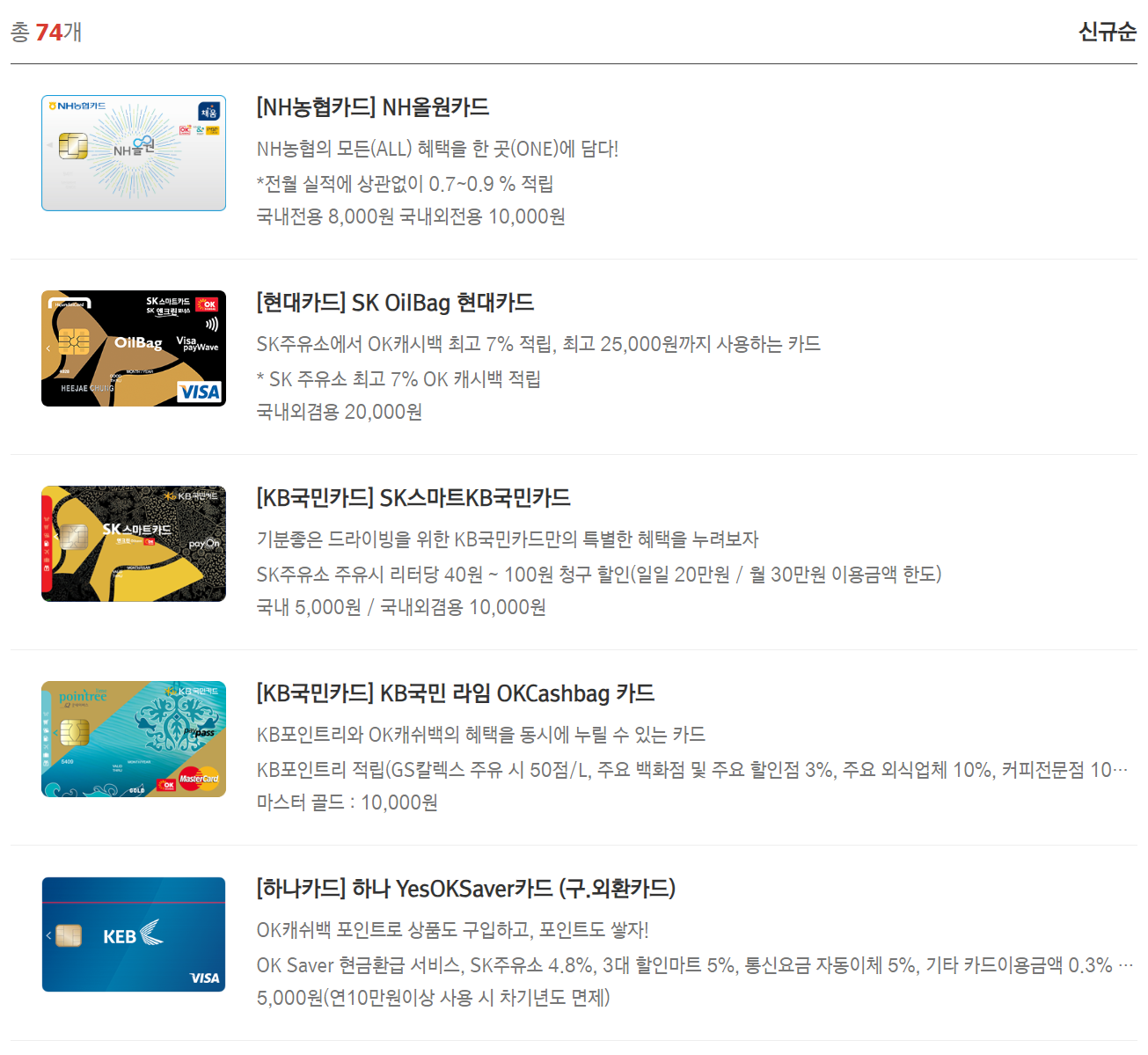 3. 신용카드의 경우 현재 총 74개가 있으며 주요 카드사에서 대부분 취급을 하고 있습니다. 결과에서 간단하게 혜택과 연회비가 나와 있는데 마음에 드는 카드를 선택 합니다.