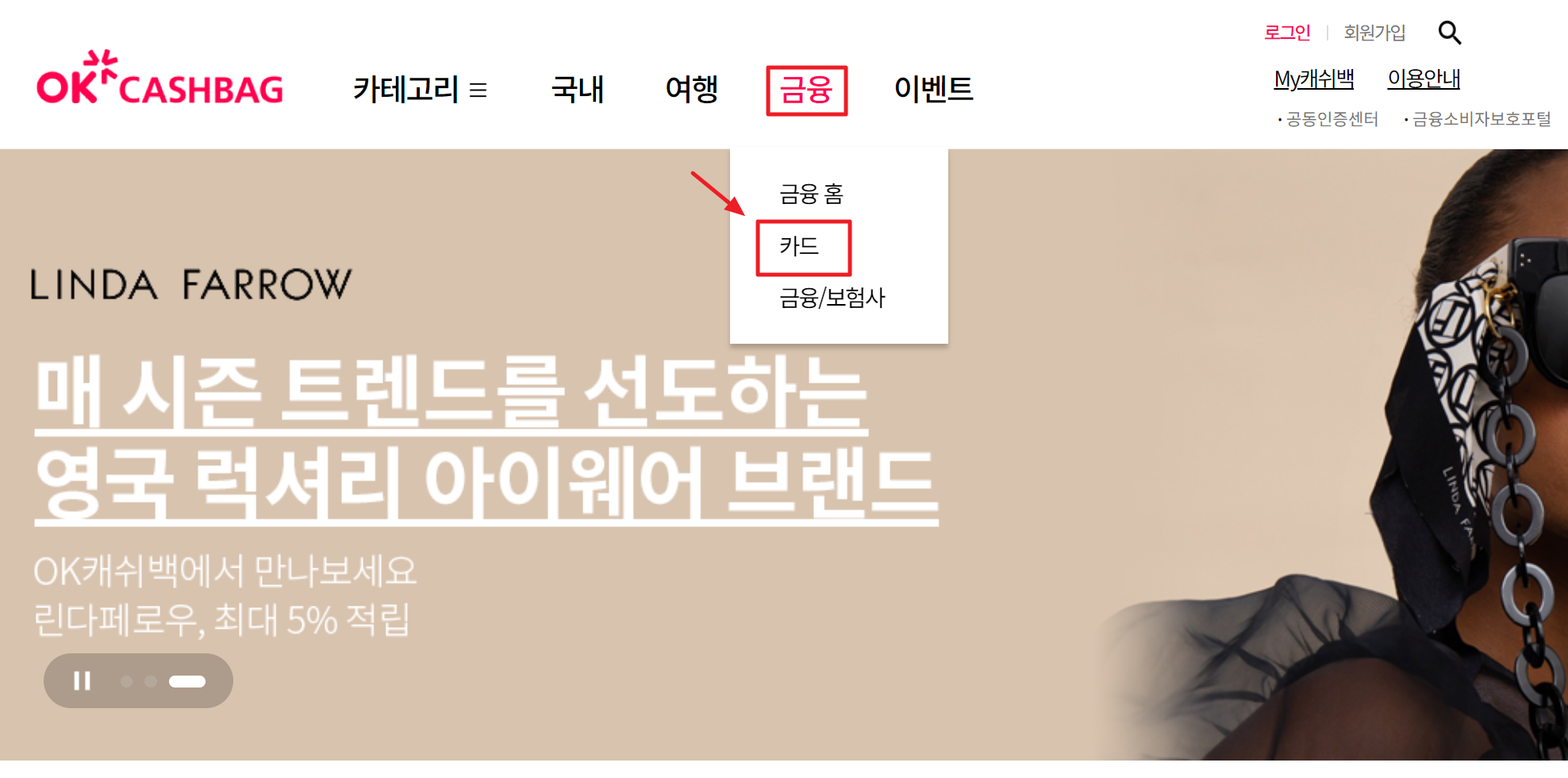 1. OK캐쉬백 카드는 OK캐쉬백 포인트를 쉽게 적립하고 사용할 수 있는데요. 제휴 가맹점에서 결제할 때 자동으로 포인트가 적립되며 적립된 포인트는 다양한 상품 구매나 서비스 이용에 사용할 수 있습니다. OK캐쉬백 카드는 별도로 발급받아 사용할 수 있고 추가로 카드 종류에 따라 적립률이 다를 수 있으며 특정 가맹점에서 더 높은 포인트를 적립할 수 있는 혜택도 제공되니 발급 전에 조건을 확인하는 것이 좋습니다. ok캐쉬백 카드 발급 신청은 상단 메뉴에서 ‘금융->카드’ 메뉴로 이동합니다.