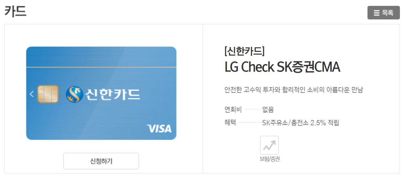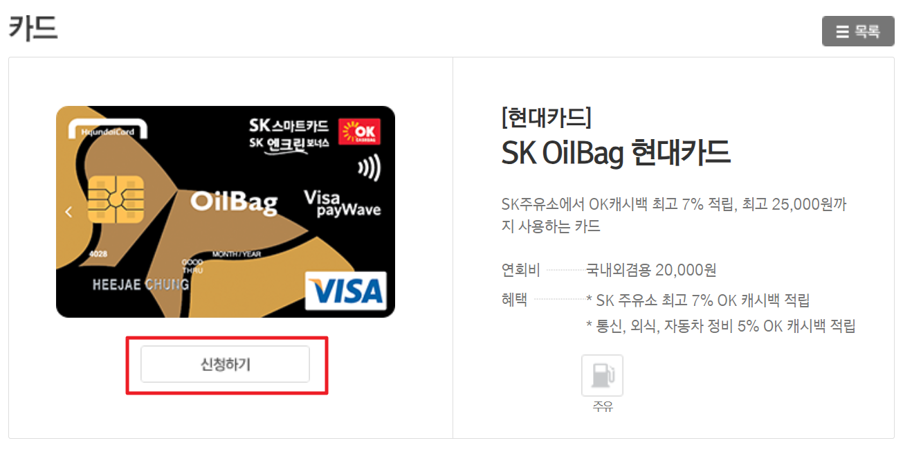 4. 선택을 하면 더 자세한 내용과 연회비, 혜택 등을 확인 할 수 있는데요. 신청하기를 눌러서 카드 신청이 가능합니다. 재발급의 경우에도 신청하기를 눌러서 재발급을 받을 수 있습니다.