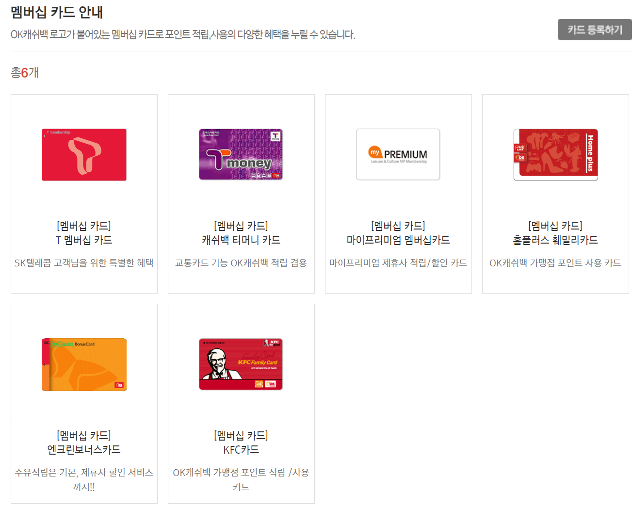7. 멤버십 카드는 ok캐쉬백 로고가 있는 카드로 포인트 적립 및 사용이 가능합니다. 현재 총 6개가 있으며 t 멤버십, 티머니, 마이프리미엄, 홈플러스, 엔크린, KFC카드 등 멤버십 카드를 신청 할 수 있습니다.