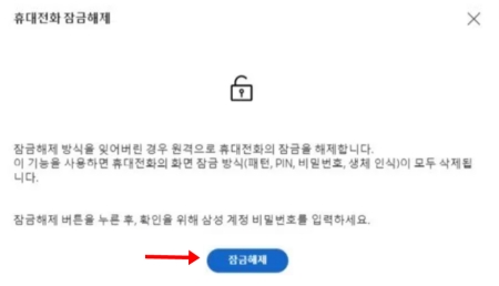 4. 잠금해제를 선택하면 '휴대전화 잠금해제' 창이 나타납니다. 이 기능을 사용하면 패턴, 'PIN', 비밀번호, 생체 인식 등 모든 화면 잠금 방식이 삭제된다는 안내를 확인할 수 있습니다. 내용을 확인한 후 삼성 계정 비밀번호를 입력하고 아래의 파란 '잠금해제' 부분을 눌러주세요.