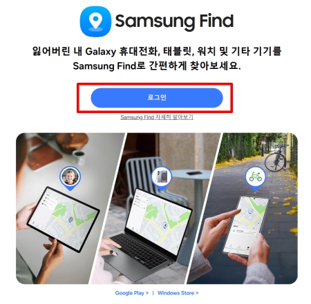 2. 시작하기를 누르면 로그인 화면으로 이동하게 됩니다. 잃어버린 내 'Galaxy' 휴대전화, 태블릿, 워치 및 기타 기기를 간편하게 찾아보라는 안내 문구를 확인할 수 있어요. 화면 중앙에 위치한 파란색 '로그인' 부분을 눌러 본인의 삼성 계정으로 접속을 진행해 주세요.