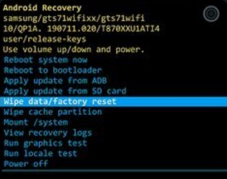 6. 여러 키를 동시에 눌러 '리커버리 모드'에 성공적으로 진입했다면 영어로 된 여러 메뉴가 나타납니다. 볼륨 키를 이용해 위아래로 이동하여 'Wipe data/factory reset' 항목으로 이동한 후 전원 키를 눌러 선택해 주세요. 이 과정을 통해 기기의 모든 데이터가 삭제되면서 초기화가 진행됩니다.