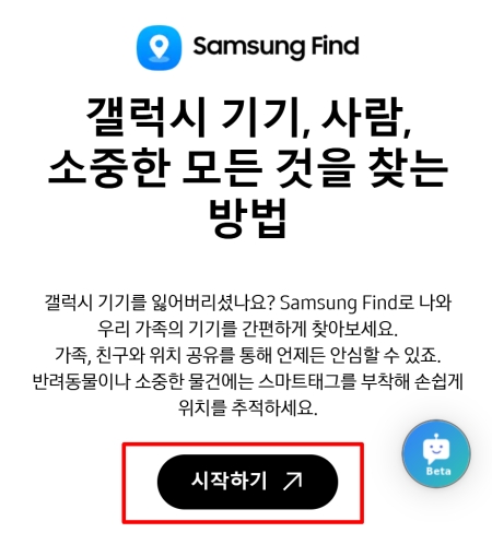 1. 삼성 'Find' 홈페이지에 들어가면 '갤럭시 기기, 사람, 소중한 모든 것을 찾는 방법'이라는 문구가 보입니다. 여기서 나와 가족의 기기를 찾거나 위치를 공유하는 등의 여러 가지 기능을 확인할 수 있는데, 화면 중앙에 보이는 '시작하기'를 눌러 다음 단계로 넘어가 주세요.
