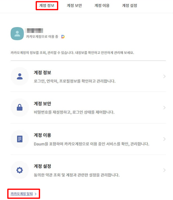 5. 계정 정보 화면으로 이동하면 여러 관리 메뉴가 나타납니다. 여기서 맨 아래쪽에 있는 '카카오계정 탈퇴' 항목을 찾아서 선택해 주세요.