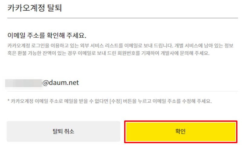 8. 계정 삭제와 관련된 안내 사항을 이메일로 보내준다는 내용이 나옵니다. 자신의 이메일 주소가 맞는지 확인하고, 이상이 없다면 '확인'을 눌러주세요.