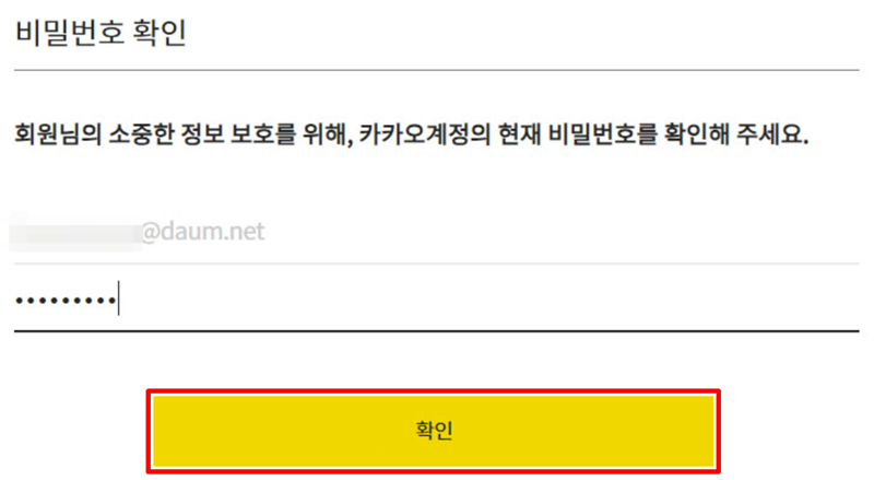 7. 본인 확인을 위해 현재 사용 중인 계정의 비밀번호를 다시 한번 입력해야 합니다. 비밀번호를 입력한 뒤 아래의 '확인'을 선택하여 다음 절차를 진행하세요.