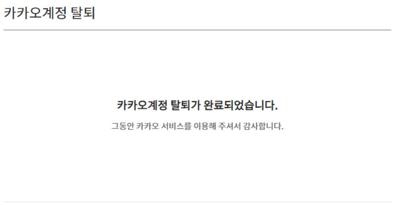 9. 모든 절차가 마무리되면 '카카오계정 탈퇴가 완료되었습니다'라는 메시지가 나타납니다. 이 화면이 보이면 계정이 성공적으로 정리된 것입니다.