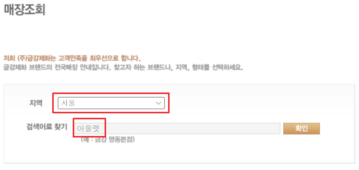 2. 매장 조회는 대한민국 전체로 가능하며 지역을 선택하고 검색어로 찾기에 ‘아울렛’을 입력한 뒤 확인을 눌러줍니다.