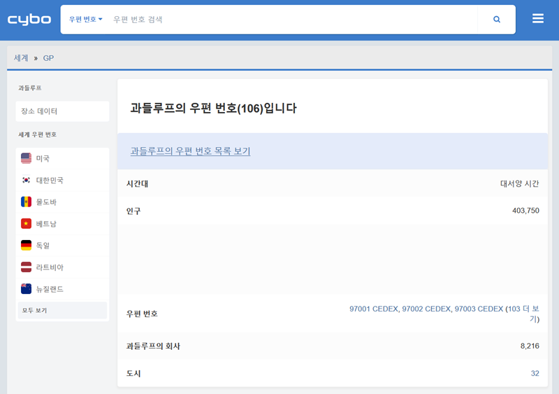6. 국가를 선택하면 해당 국가의 시간대, 인구, 전체 우편번호 개수 등 기본적인 정보를 먼저 보여주기도 합니다. 과들루프의 경우 총 106개의 우편번호가 있다는 것을 미리 알 수 있습니다.