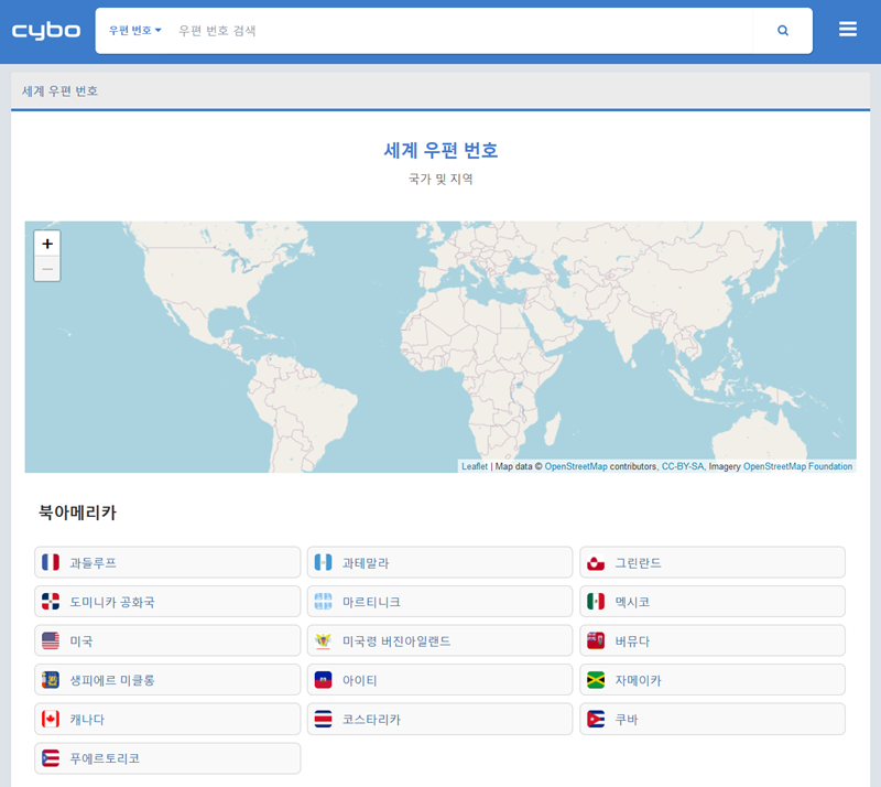 5. 다른 형태의 사이트에서는 세계 지도와 함께 국가 목록이 나타나기도 합니다. 여기서 북아메리카의 과들루프처럼 원하는 국가를 선택하여 우편번호 정보를 단계적으로 찾아 나갈 수 있습니다.