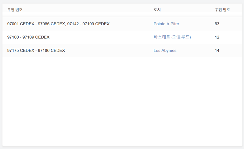 7. 상세 목록에서는 특정 도시나 지역에 할당된 우편번호 범위를 구체적으로 확인할 수 있습니다. 예를 들어, '푸앵타피트르'라는 도시에는 여러 개의 우편번호가 사용되는 것을 볼 수 있습니다.