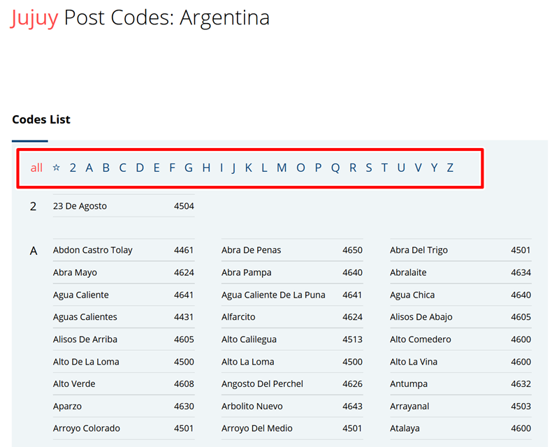 4. 지역까지 선택했다면 세부 도시나 마을 이름과 함께 우편번호 목록이 표시됩니다. 내용이 많을 경우 알파벳순으로 정렬된 목록을 이용하면 더 빠르고 정확하게 원하는 곳을 찾을 수 있습니다.