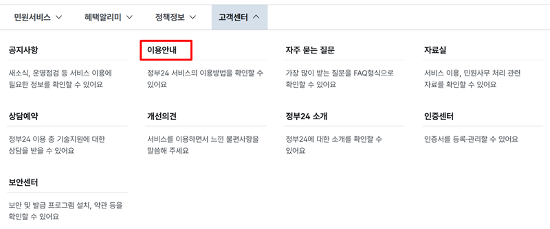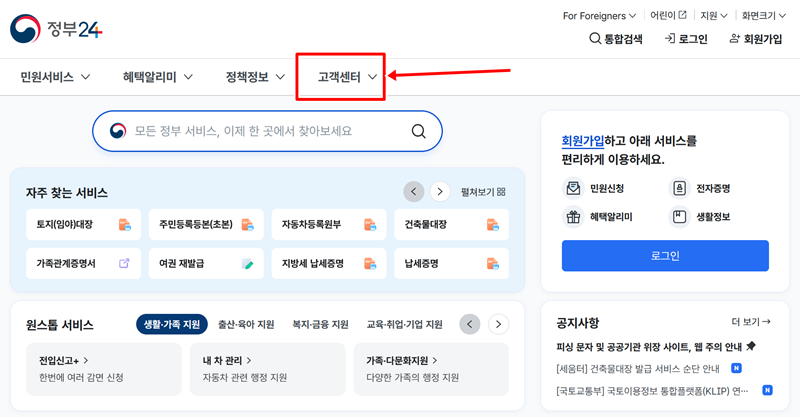 1. 정부24 홈페이지 상단 메뉴 중 고객센터를 찾아주세요. 여러 메뉴가 나란히 있으니 찾기 어렵지 않으실 거예요.