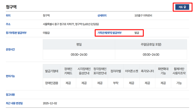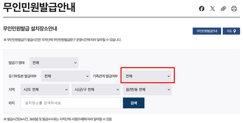 4. 발급기 설치 장소를 찾는 화면이 나타나면 다양한 검색 조건 중에서 가족관계 발급여부 항목을 확인해 주세요.