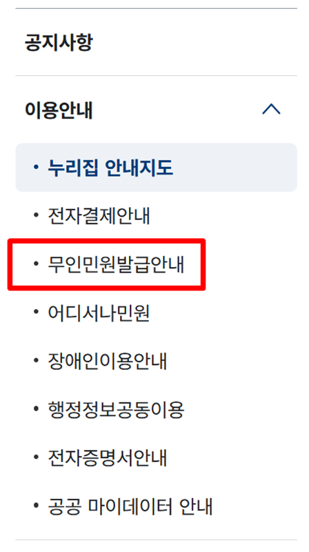 3. 이용안내로 들어가면 왼쪽에 여러 목록이 보입니다. 여기서 무인민원발급안내를 찾아 선택해 주세요.