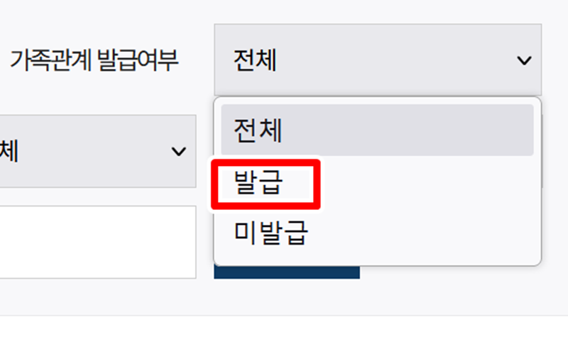 5. 가족관계 발급여부 항목을 누르면 전체, 발급, 미발급 중에서 선택할 수 있습니다. 우리는 발급을 선택하면 됩니다.