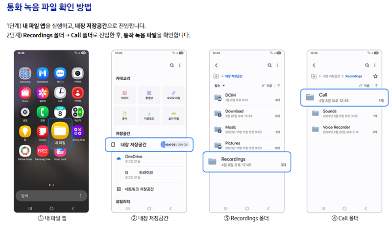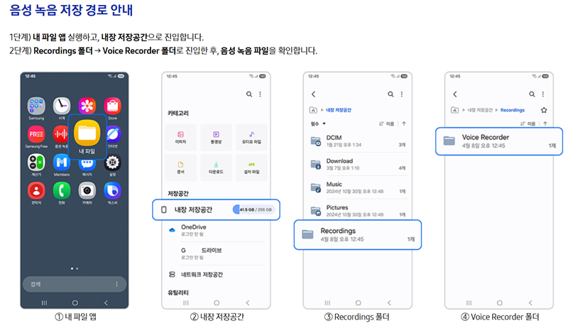 5. 저장된 파일을 찾으려면 내 파일 앱을 실행한 후 내장 저장공간으로 들어갑니다. 그곳에서 Recordings 폴더를 찾아 들어가면 방금 기록한 목소리 파일들을 확인할 수 있습니다.