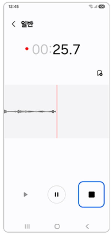 3. 녹음이 진행되면 화면 중앙의 숫자가 올라가며 소리의 파형이 움직이는 것을 볼 수 있어요. 잠시 멈춰야 할 때는 일시정지 표시를 모든 과정이 끝났다면 사각형 모양을 눌러 종료하면 됩니다.