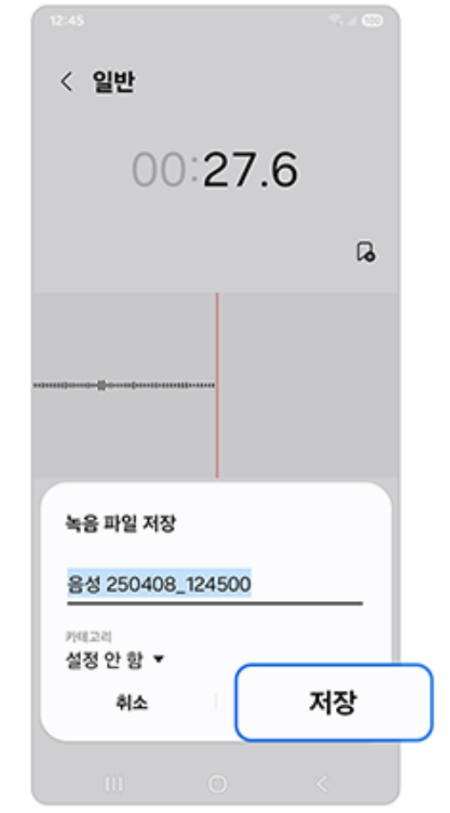 4. 녹음을 마치면 파일의 이름을 설정하는 팝업 창이 뜨게 됩니다. 나중에 어떤 내용인지 쉽게 알아볼 수 있도록 구체적인 제목을 입력한 뒤 저장 글자를 누르면 안전하게 보관돼요.