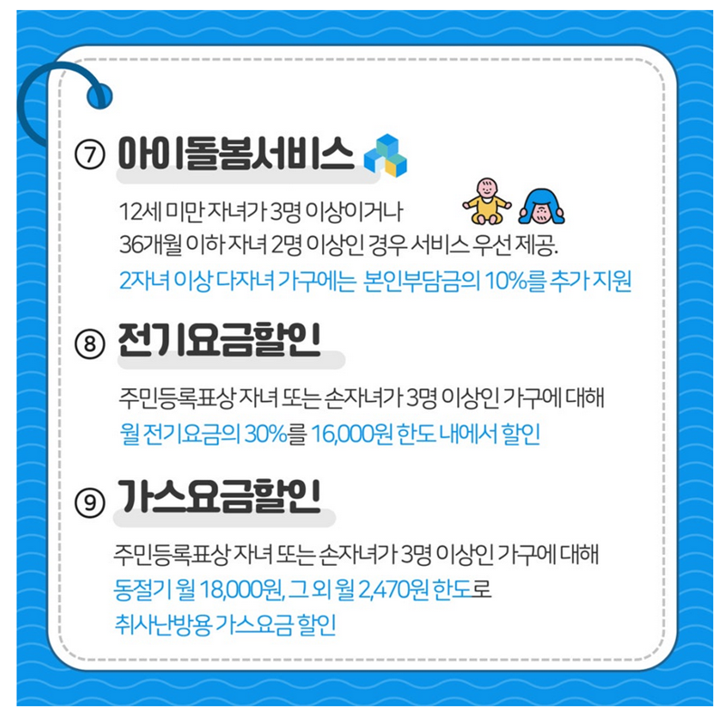 7. 생활 속에서 체감할 수 있는 실질적인 지원도 있습니다. 12세 미만 자녀가 3명 이상인 경우 아이돌봄서비스를 우선적으로 이용할 수 있고, 3자녀 이상 가구는 전기요금과 도시가스요금 할인도 받을 수 있습니다.