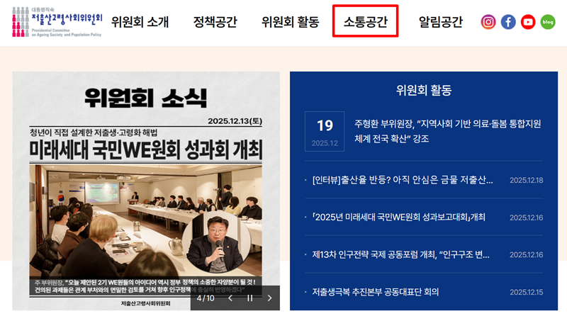 1. 저출산고령사회위원회 홈페이지에 접속하면 상단 메뉴 중 '소통공간'이라는 항목이 보입니다. 이곳을 통해 다양한 정책 관련 소식을 접할 수 있습니다.