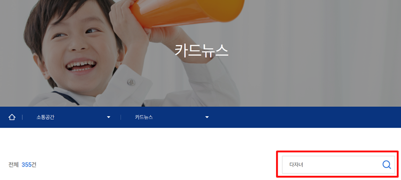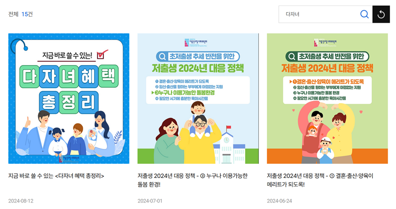 3. 카드뉴스 게시판으로 이동한 뒤, 오른쪽에 있는 검색창을 활용하면 원하는 정보를 빠르게 찾을 수 있습니다. 검색창에 '다자녀'라고 입력하고 검색을 실행해 주세요.