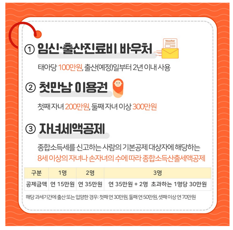 5. 먼저 임신과 출산 과정에서 직접적인 도움이 되는 혜택들이 있습니다. 태아 당 100만 원의 진료비 바우처를 받을 수 있고, 첫째 아이에게는 200만 원, 둘째부터는 300만 원의 첫만남 이용권이 주어집니다. 또한 자녀 수에 따라 연말정산 시 세액공제도 받을 수 있습니다.