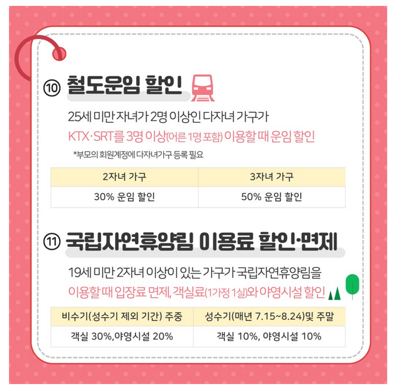 8. 가족과 함께 여가를 즐길 때도 혜택을 누릴 수 있습니다. 25세 미만 자녀가 2명 이상인 가구는 KTX나 SRT 같은 철도 운임을 할인받을 수 있으며, 19세 미만 자녀가 2명 이상이라면 국립자연휴양림 이용료도 할인 또는 면제받을 수 있습니다.