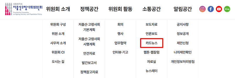 2. '소통공간' 메뉴 위에 마우스를 가져가면 여러 하위 목록이 나타납니다. 그중에서 '카드뉴스'를 선택하면 정책 정보들을 이미지와 함께 쉽게 이해할 수 있는 자료실로 이동합니다.