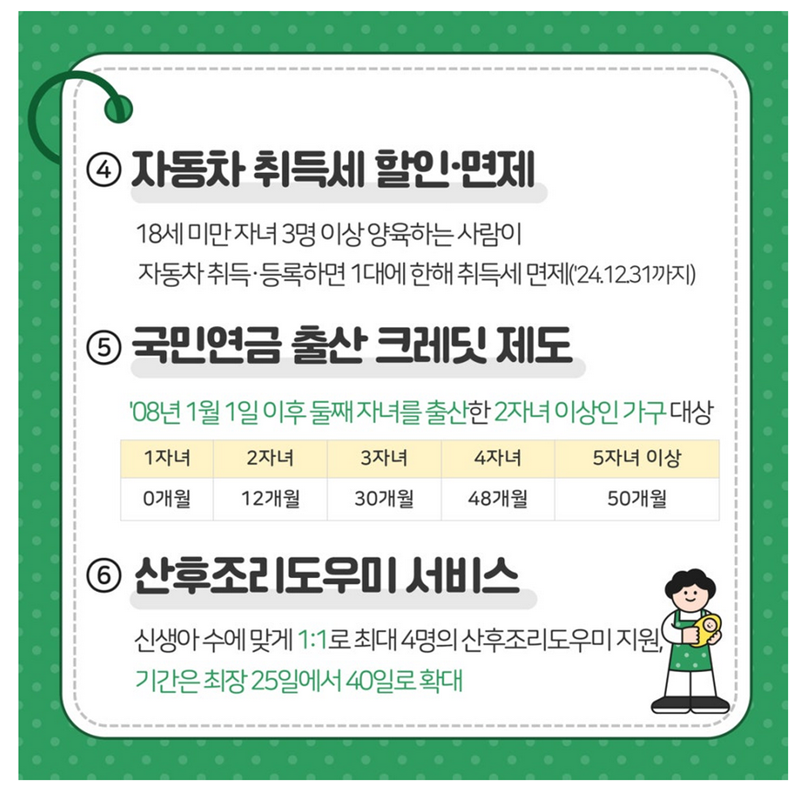 6. 자녀가 성장함에 따라 필요한 혜택도 마련되어 있습니다. 18세 미만 자녀가 3명 이상인 가구는 자동차 취득세를 감면받을 수 있으며, 둘째 자녀부터는 국민연금 가입 기간을 추가로 인정해주는 출산 크레딧 제도도 있습니다.