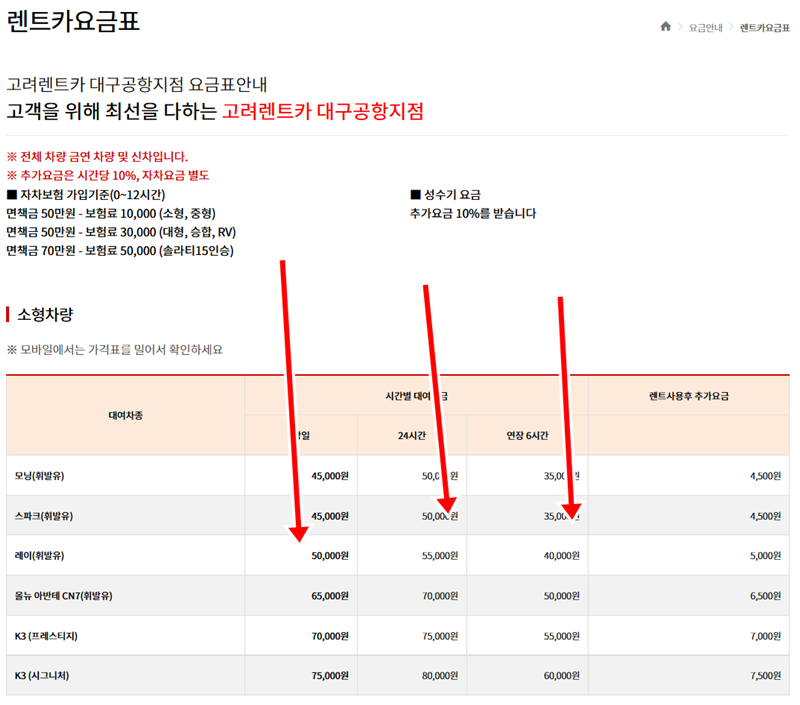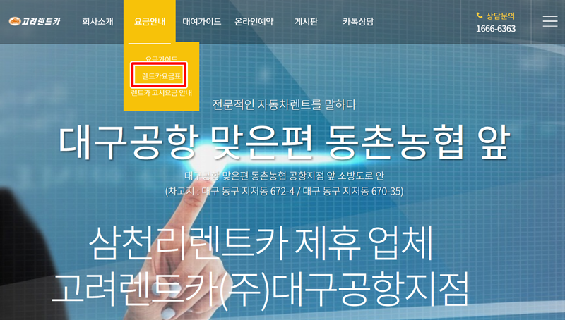 6. '고려렌트카' 대구공항지점처럼 특정 지점의 홈페이지를 방문하여 요금을 알아보는 방법도 있습니다. 보통 메인 화면의 '요금안내' 메뉴에서 '요금표'를 쉽게 찾아볼 수 있어요.