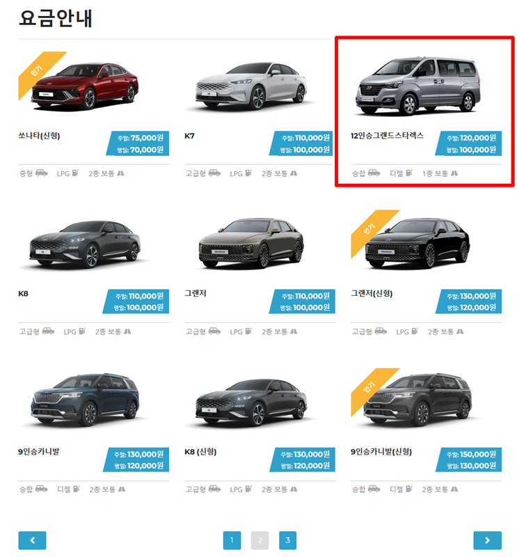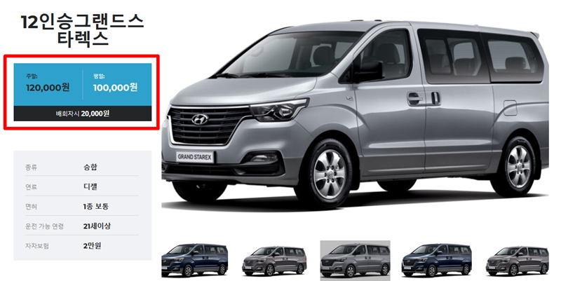 2. 다양한 차종 목록에서 '12인승 그랜드 스타렉스'를 선택하면 주중과 주말 및 공휴일의 기본 요금을 한눈에 확인할 수 있어 비교가 편리합니다.