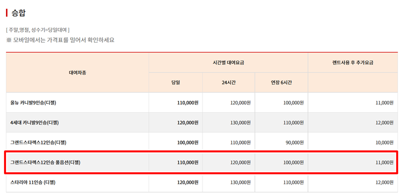 7. 요금표를 보면 '그랜드스타렉스 12인승 풀옵션' 모델의 당일 이용 시 110,000원, 24시간 기준 120,000원 등 시간 단위로 세분화된 요금을 확인할 수 있어 계획에 맞춰 비용을 계산하기 좋습니다.
